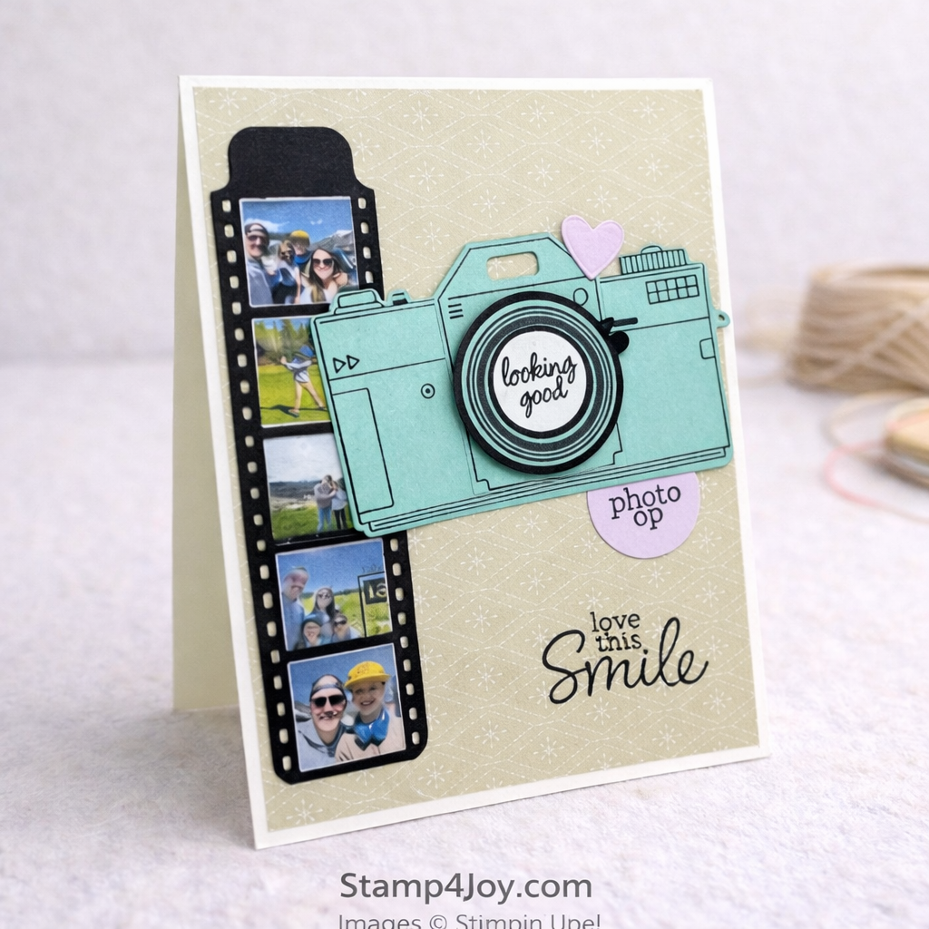 From there, I assembled the cameras — hers in Bubble Bath and his in Coastal Cabana. I added the sentiment “looking good” in the center of the lens, and “photo op” tucked just underneath on the right.